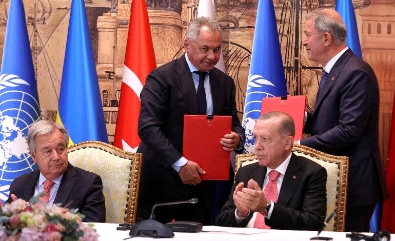 وقعت روسيا وأوكرانيا في مدينة إسطنبول اليوم الجمعة، على اتفاق يسمح بتصدير الحبوب برعاية الأمم المتحدة ووساطة تركية. وجرت مراسم توقيع الاتفاق في قصر دولمة بهجة التاريخي بحضور الرئيس التركي رجب طيب أردوغان والأمين العام للأمم المتحدة أنطونيو غوتيريش. ووقع وزير الدفاع الروسي سيرغي شويغو على الاتفاق بشكل منفصل مع نظيره التركي…
