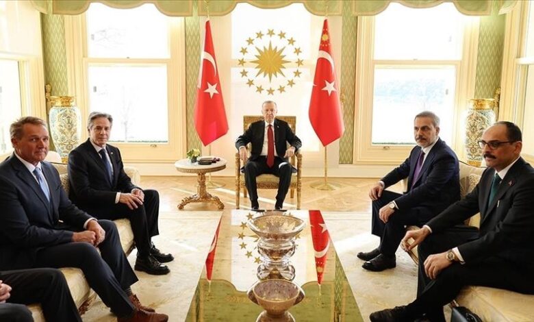 استقبل الرئيس التركي رجب طيب أردوغان، السبت، وزير الخارجية الأمريكي أنتوني بلينكن، في مدينة إسطنبول.وجرى اللقاء في قصر وحيد الدين بإسطنبول، وحضره وزير الخارجية التركي هاكان فيدان، ورئيس جهاز الاستخبارات إبراهيم قالن، والسفير الأمريكي لدى أنقرة جيفري فليك.وفي وقت سابق السبت، عقد فيدان وبلينكن لقاء تناولا فيه “الحرب في غزة، والأزمة الإنسانية،…