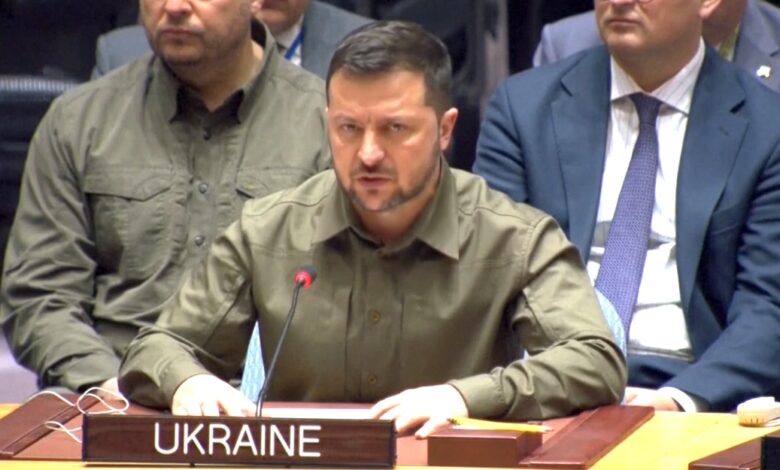 قال الرئيس الأوكراني فولوديمير زيلينسكي،، لمجلس الأمن الدولي إن “الغزو الروسي لبلاده إجرامي”، وطلب تجريد موسكو من حق النقض (فيتو) في الهيئة.وصرح زيلينسكي فيما كان سفير روسيا لدى الأمم المتحدة يجلس أمامه، “معظم العالم يعرف حقيقة هذه الحرب. إنها عدوان إجرامي وغير مبرر من جانب روسيا ضد بلدنا يهدف إلى السيطرة على…
