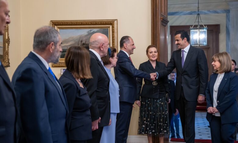 عقد حضرة صاحب السمو الشيخ تميم بن حمد آل ثاني أمير البلاد المفدى، اجتماعا مع فخامة الرئيسة إيكاترينا ساكيلاروبولو رئيسة الجمهورية اليونانية الصديقة، بقصر الرئاسة في العاصمة أثينا اليوم.وفي بداية الاجتماع، رحبت فخامة الرئيسة اليونانية بسمو الأمير المفدى والوفد المرافق، منوهة بالتطور الكبير الذي تشهده علاقات البلدين، ومعربة عن أملها في أن…