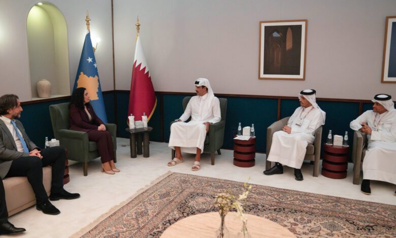استقبل حضرة صاحب السمو الشيخ تميم بن حمد آل ثاني أمير البلاد المفدى، فخامة الرئيسة فيوسا عثماني رئيسة جمهورية كوسوفو، وذلك على هامش قمة الويب قطر 2024، بمركز الدوحة للمعارض والمؤتمرات، مساء اليوم.تم خلال المقابلة استعراض علاقات التعاون بين البلدين، والسبل الكفيلة بدعمها وتنميتها، إضافة إلى مناقشة عدد من القضايا ذات الاهتمام…