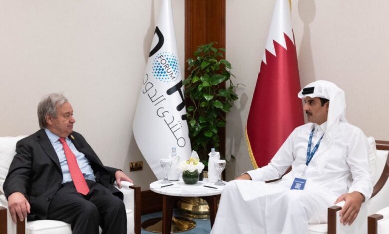استقبل حضرة صاحب السمو الشيخ تميم بن حمد آل ثاني أمير البلاد المفدى، سعادة السيد أنطونيو غوتيريش الأمين العام للأمم المتحدة، وذلك على هامش منتدى الدوحة 2023، بفندق شيراتون الدوحة صباح اليوم.جرى خلال المقابلة بحث عدد من المستجدات الإقليمية والدولية، وفي مقدمتها الوضع في منطقة الشرق الأوسط، خاصة تطورات الأوضاع في غزة…
