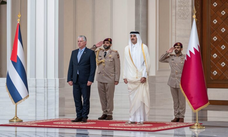عقد حضرة صاحب السمو الشيخ تميم بن حمد آل ثاني أمير البلاد المفدى، جلسة مباحثات رسمية بقصر لوسيل اليوم، مع فخامة الرئيس ميغيل دياز كانيل بيرموديز رئيس جمهورية كوبا الصديقة.وفي بداية الجلسة، رحب سمو الأمير بفخامة الرئيس الكوبي والوفد المرافق، متمنيا لهم طيب الإقامة وللعلاقات بين البلدين المزيد من التطور والنماء في…