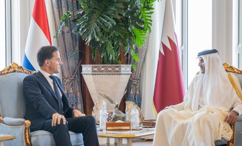 عقد حضرة صاحب السمو الشيخ تميم بن حمد آل ثاني أمير البلاد المفدى، ودولة السيد مارك روته رئيس وزراء مملكة هولندا، جلسة مباحثات رسمية بالديوان الأميري اليوم.في بداية الجلسة أعرب سمو الأمير المفدى عن ترحيبه بدولة رئيس الوزراء الهولندي والوفد المرافق في الدوحة، متمنيا للعلاقات بين البلدين المزيد من التطور والنماء.من جانبه…