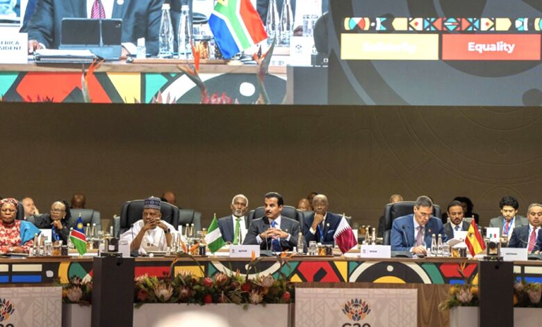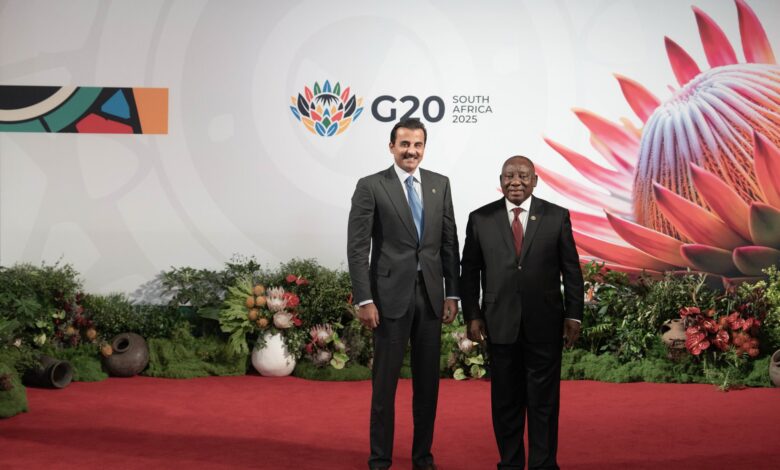 شارك حضرة صاحب السمو الشيخ تميم بن حمد آل ثاني أمير البلاد المفدى، في قمة مجموعة العشرين 2025، التي عقدت تحت شعار “التضامن والمساواة والاستدامة” في مركز جوهانسبرغ للمعارض بمدينة جوهانسبرغ في جمهورية جنوب أفريقيا الصديقة. وشارك في القمة عدد من أصحاب الفخامة والسمو والمعالي والسعادة قادة الدول الأعضاء في المجموعة، ورؤساء…