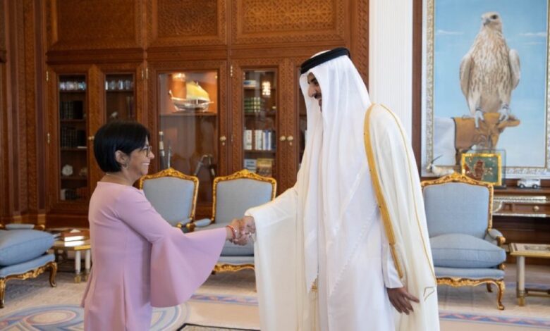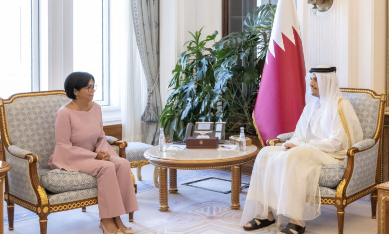 استقبل حضرة صاحب السمو الشيخ تميم بن حمد آل ثاني أمير البلاد المفدى، في مكتبه بالديوان الأميري صباح اليوم، سعادة الدكتورة ديلسي الوينا رودريغيز غوميز نائب رئيس جمهورية فنزويلا البوليفارية الصديقة، والوفد المرافق بمناسبة زيارتها للبلاد.وفي بداية المقابلة نقلت سعادة الدكتورة ديلسي لسمو الأمير المفدى تحيات فخامة الرئيس نيكولاس مادورو رئيس جمهورية…