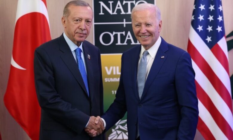 اعتبر الرئيس التركي رجب طيب أردوغان لقاء نظيره الأمريكي جو بايدن في ليتوانيا بمثابة “مرحلة جديدة” في العلاقات بين البلدين.جاء ذلك خلال اللقاء الذي جمع الرئيسين بحضور الصحفيين، على هامش قمة زعماء حلف شمال الأطلسي “الناتو” التي استضافتها العاصمة الليتوانية فيلنيوس يومي 11 و12 يوليو الجاري.وقال الرئيس التركي: “لقاءاتنا السابقة كانت تحضيرا…