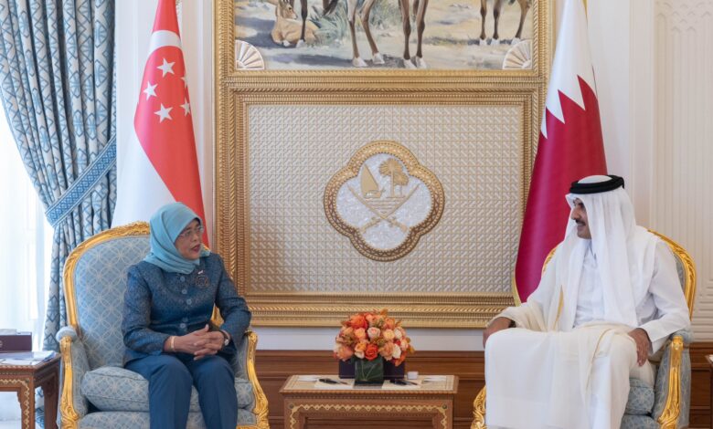 سمو الأمير يعقد جلسة مباحثات رسمية مع رئيسة سنغافورةعقد حضرة صاحب السمو الشيخ تميم بن حمد آل ثاني أمير البلاد المفدى، وفخامة الرئيسة حليمة يعقوب رئيسة جمهورية سنغافورة، جلسة مباحثات رسمية في الديوان الأميري صباح اليوم.وفي بداية الجلسة، رحب سمو الأمير المفدى بفخامة الرئيسة والوفد المرافق لها، متمنيا لهم طيب الإقامة، ومتطلعا…