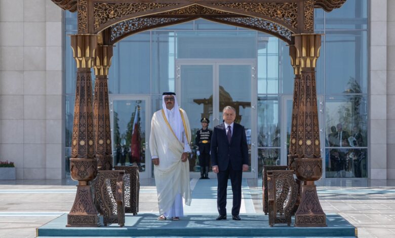 أقيمت لحضرة صاحب السمو الشيخ تميم بن حمد آل ثاني أمير البلاد المفدى، مراسم استقبال رسمية لدى وصوله مركز المؤتمرات بمدينة سمرقند في جمهورية أوزبكستان الصديقة صباح اليوم.وقد كان في مقدمة مستقبلي سموه، فخامة الرئيس شوكت ميرضيائيف رئيس جمهورية أوزبكستان.وبدأت المراسم بعزف النشيدين الوطنيين القطري والأوزبكي، بعدها قام سمو الأمير باستعراض حرس…