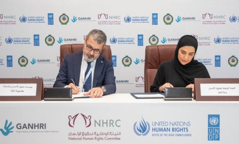 وقعت سعادة السيدة مريم بنت عبد الله العطية رئيس اللجنة الوطنية لحقوق الإنسان مذكرة تفاهم مع سعادة الدكتور محرم كيليش رئيسمؤسسة حقوق الإنسان والمساواة في الجهورية التركية.وتهدف المذكرة إلى تعزيز التعاون بين الطرفين في نشر الأفكار والمبادرات والممارسات الإنسانية، والمساهمة في تعزيز وحماية حقوقالإنسان لكلا البلدين، بالإضافة إلى التنسيق والشراكة وتبادل الخبرات وفقا لقوانين ولوائح كل بلد، بما يسهم في تعزيز وحماية حقوقالإنسان.كما تهدف إلى توظيف خبرات الطرفين لتحقيق استجابة مستدامة وفعالة لجميع الأنشطة الإنسانية والحقوقية، وتكثيف التعاون حول تطويرالاستراتيجيات وخطط العمل.وتتضمن مجالات التعاون تعزيز الإطار التشريعي الوطني للمشاركين وفقا للاتفاقيات الدولية، والمشاركة في البرامج التدريبية حول قضاياحقوق الإنسان وإجراء البحوث المشتركة، والقيام بأنشطة إعلامية وتوعوية مشتركة ذات اهتمام مشترك، فضلا عن تعزيز التنسيق بينالطرفين لتسهيل تنفيذ الالتزامات الدولية في مجال حقوق الإنسان.تأتي مذكرة التفاهم إدراكا للحاجة إلى تحسين آليات حماية حقوق الإنسان والحريات الأساسية وتعزيز المؤسسات الديمقراطية وسيادةالقانون، والتعاون المشترك لحماية فعالة لحقوق الإنسان.