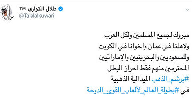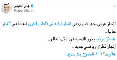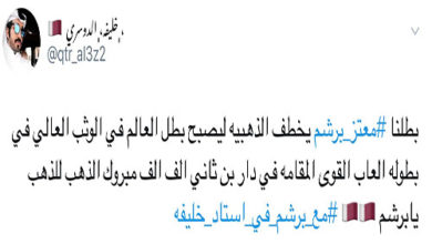 أحرز بطلنا الأولمبي والعالمي معتز برشم ذهبية بطولة العالم لالعاب القوى في مسابقة الوثب العالي عندما أحرز الميدالية الذهبية اليوم باستاد خليفة الدولي. وأنهى برشم تنافساً مثيراً لصالحه؛ بعدما سجّل ارتفاعاً قدره 2.37 متر، ليتصدر الجدول النهائي بمسابقة الوثب العالي في مونديال القوى.واحتفظ برشم بلقبه كبطل للعالم في الوثب العالي والذي حققه في بطولة العالم الماضية في لندن عام 2017 ليتوج نفسه ملكا لهذه المسابقة.وسجل برشم ارتفاعا قدره 37ر2 متر من أول محاولة وبعد ضمان الذهبية، اكتفى برشم ولم يسع لكسر الرقم القياسي من جديد الذي تسبب في إصابته من قبل. وبعد تحقيقه الانجاز تلقى برشم التهنئة في أرض الملعب من سعادة الشيخ جوعان بن حمد آل ثاني رئيس اللجنة الأولمبية القطرية ورئيس اللجنة المنظمة العليا لبطولة العالم لألعاب القوى الدوحة 2019 ، ثم طاف أرض الملعب وتفاعل بالتحية مع عشرات الآلاف من القطريين الذين احتشدوا في ستاد خليفة الدولي لدعمه ومساندته.