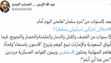 اتهم زعيم قبلي يمني اليوم الإمارات بإدخال إسرائيل إلى جزيرة سقطرى في المحيط الهندي قبالة السواحل الجنوبية للبلاد. جاء ذلك في بيان لشيخ مشايخ قبائل محافظة أرخبيل سقطرى اليمنية عيسى سالم بن ياقوت، وذلك بعد أيام من كشف موقع أميركي متخصص في الأبحاث العسكرية والإستراتيجية عن وصول وفد إماراتي إسرائيلي…