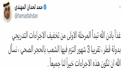 بدءا من صلاة الفجر يوم غد الاثنين 15 يونيو ستعود الصلوات الى مساجد الدوحة عدا الجمعة وسيتم افتتاح جميع المساجد بعد إغلاقها جراء جائحة كورونا.وستزدان 500 مسجد ستزدان بالمصلين في فجر غد بعد أن يعاد افتتاحها ضمن المرحلة الأولى من مراحل الرفع التدريجي للتدابير الاحترازية وقيود كورونا في مختلف مناطق…