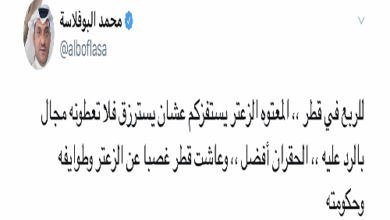 إلى الجار الله من غير تحية.. لتعلم أنت ومن هم على شاكلتك من بلشتية الإعلام ، إن سمو تميم المجد هو تميم الأمس واليوم والغد لايتغيّر .نشكرك على اعترافك بفشل الحصار وخطأ حسابات السعودية والإمارات وخسائرهم ، واستفادة قطر من ذلك وخاصة على الصعيدين السياسي والاقتصادي.أما تسويقك لمقولة اماراتية بان…
