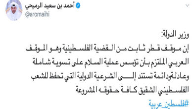 أكدت دولة قطر على موقفها الثابت من القضية الفلسطينية، وهــو الموقف العربي الملتزم بأن تؤسـس عـملية السـلام عـلى تـسوية شاملة وعادلـة ودائمة تسـتند إلى الشرعية الدولية التي تحفظ للشعب الفلسطيني الشقيق كافة حقوقه المشروعة وفي مقدمتها حقه في تقرير مصيره وإقامة دولته المستقلة على حدود الرابع من يونيو 1967م، وعاصمتها…