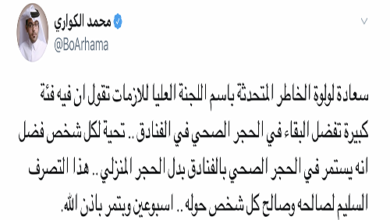 أعلنت سعادة السيدة لولوة بنت راشد الخاطر المتحدث الرسمي باسم اللجنة العليا لإدارة الأزمات أن وزارة الصحة ستفتح بالتعاون مع عدد من المؤسسات مثل الهلال الأحمر القطري وقطر الخيرية وغيرهما، باب التطوع للأفراد الذين تترواح أعمارهم بين 20 – 45 سنة للدعم الطبي أو اللوجستي كل بحسب خبرته ووفقا للشروط…