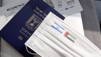 عرض حساب “إسرائيل بالعربية”، التابع للخارجية الإسرائيلية في “تويتر”، صورة لكمامة واقية مطبوع عليها العلمين الإماراتي والإسرائيلي. وأرفق الحساب الصورة بتعليق قال فيه “بالكمامة المطبوع عليها العلمان الإماراتي والإسرائيلي يعرض أحد ركاب الرحلة المباشرة من إسرائيل إلى الإمارات أولى لحظاتها التاريخية”. ونشر الحساب ذاته، صورة أخرى وصفها بـ”التاريخية” من مطار…