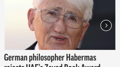 ذكرت وكالة ” أسوشيتد برس” ان الفيلسوف وعالم الاجتماع الألماني البارز يورغن هابرماس اعلن تراجعه عن قرار تسلم جائزة الشيخ زايد للكتاب، بسبب “النظام السياسي القائم هناك” في أبو ظبي.وقال الفلسفي المخضرم البالغ من العمر 91 عاما في بيان سلمه ناشره إلى موقع Spiegel Online اليوم الأحد: “سبق أن أعربت…