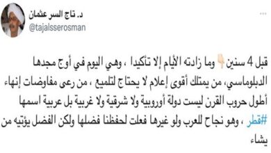 ذكر موقع الرق أن سعادة الدكتور حمد بن عبدالعزيز الكواري، وزير الدولة ورئيس مكتبة قطر الوطنية أكد أن وراء استضافة قطر للمفاوضات الأفغانية رؤية أشمل وخبرة تفاوضية أعمق. وقال رئيس مكتبة قطر الوطنية في سلسلة تغريدات رصدتها الشرق بعد أن تسائل هل كان تقييم قطر دقيقا حين راهنت على استضافة…