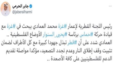 التقى السفير محمد العمادي، رئيس اللجنة القطرية لإعادة إعمار غزة، قيادة حركة حماس في قطاع غزة برئاسة السيد يحيى السنوار، اليوم الإثنين. وناقش السفير العمادي مع وفد الحركة الأوضاع السياسية الراهنة وتطورات الأوضاع على الساحة الفلسطينية، معربا عن أمله الكبير في تحقيق الاستقرار في الأراضي الفلسطينية كافة، بحسب الموقع الإلكتروني…