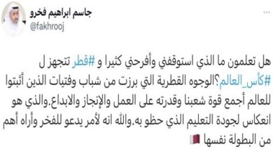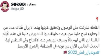 ردت اللجنة العليا للمشاريع والإرث على الادعاءات بوجود مشجعين مزيفين مدفوع لهم في قطر، واصفة هذه الادعاءات بأنها غير مفاجئة ومخيبة للآمال. وقالت اللجنة – في بيان – “مع بقاء أربعة أيام على انطلاق مونديال قطر 2022 ، تتزايد الترقب والإثارة في قطر بينما نستعد لاستقبال العالم”. وأضافت: “ساهم المشجعون…