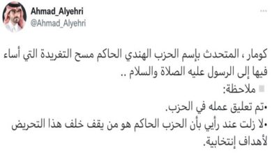 أفادت وسائل إعلام هندية بأن حزب بهاراتيا جاناتا الحاكم في الهند علّق عمل المتحدث باسمه بعد تعليقات مسيئة للنبي الكريم محمد صلى الله عليه وسلم. وقد ضجت وسائل التواصل الاجتماعي في عدد من الدول العربية والإسلامية منذ أمس السبت بالاحتجاج، وذلك بعد تغريدة نشرها نافين كومار جيندال المسؤول الإعلامي في…