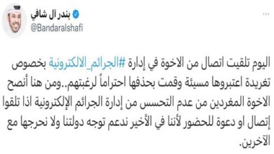 أجرى معالي الشيخ خالد بن خليفة بن عبدالعزيز آل ثاني رئيس مجلس الوزراء ووزير الداخلية، اتصالا هاتفيا مساء اليوم مع أخيه معالي الفريق أول م. الشيخ أحمد نواف الأحمد الصباح، أعرب خلاله عن تهانيه بمناسبة تعيينه رئيسا لمجلس الوزراء بدولة الكويت الشقيقة متمنيا له التوفيق والسداد وللعلاقات بين البلدين الشقيقين…
