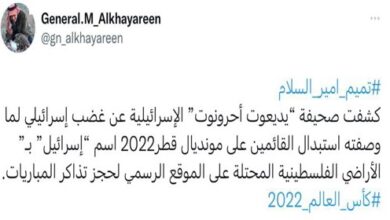 كشفت صحيفة “يديعوت أحرونوت” الإسرائيلية عن غضب إسرائيلي لما وصفته استبدال القائمين على مونديال قطر2022 اسم “إسرائيل” بـ”الأراضي الفلسطينية المحتلة على الموقع الرسمي لحجز تذاكر المباريات. وقالت الصحيفة في تقرير لها أن أولئك الذين يرغبون في شراء باقات الضيافة لألعاب كأس العالم ، التي ستفتتح في شهر نوفمبر في قطر…
