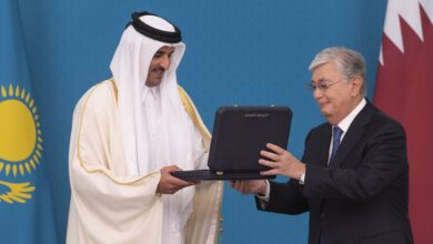 منح حضرة صاحب السمو الشيخ تميم بن حمد آل ثاني أمير البلاد المفدى، من فخامة الرئيس قاسم جومارت توكاييف رئيس جمهورية كازاخستان الصديقة، وسام النسر الذهبي الكازاخستاني “ألتين قيران” وهو أعلى وسام في جمهورية كازاخستان يمنح لرؤساء الدول الصديقة، وذلك خلال المراسم التي أقيمت في القصر الرئاسي “آق أوردا” في…