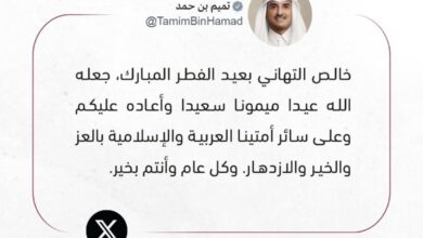 أعرب حضرة صاحب السمو الشيخ تميم بن حمد آل ثاني أمير البلاد المفدى، اليوم، عن أمنياته بأن يعيد الله سبحانه وتعالى عيد الفطر المبارك على الأمتين العربية والإسلامية بالعز والخير والازدهار. وقال سمو الأمير المفدى، في منشور عبر حسابه الرسمي على منصة التواصل الاجتماعي /إكس/: “خالص التهاني بعيد الفطر المبارك،…