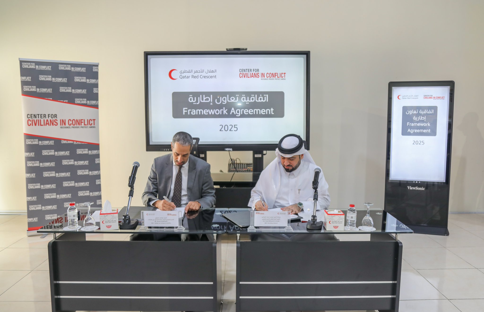 ووقع المذكرة كل من السيد فيصل محمد العمادي الأمين العام للهلال الأحمر القطري، والسيد هشام خضراوي المدير التنفيذي للمركز الدولي لحماية المدنيين في النزاعات.