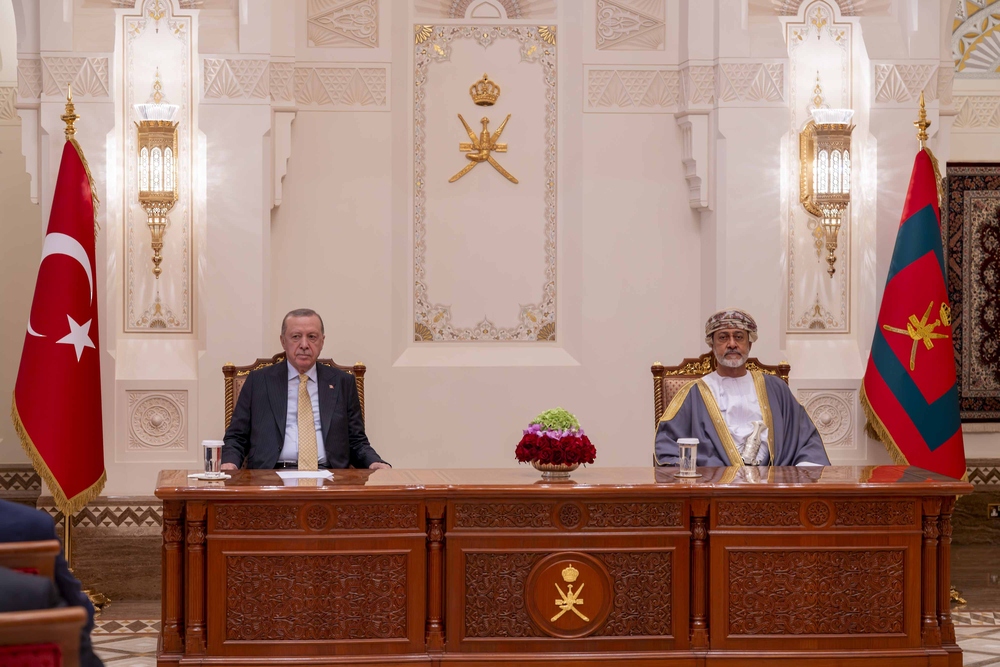شهد السلطان هيثم بن طارق سلطان عمان، اليوم، مع الرئيس التركي رجب طيب أردوغان التوقيع على إعلان وبيان مشترك و6 اتفاقيات و8 مذكرات تفاهم، في إطار زيارة الدولة يقوم بها الرئيس التركي لسلطنة عمان.