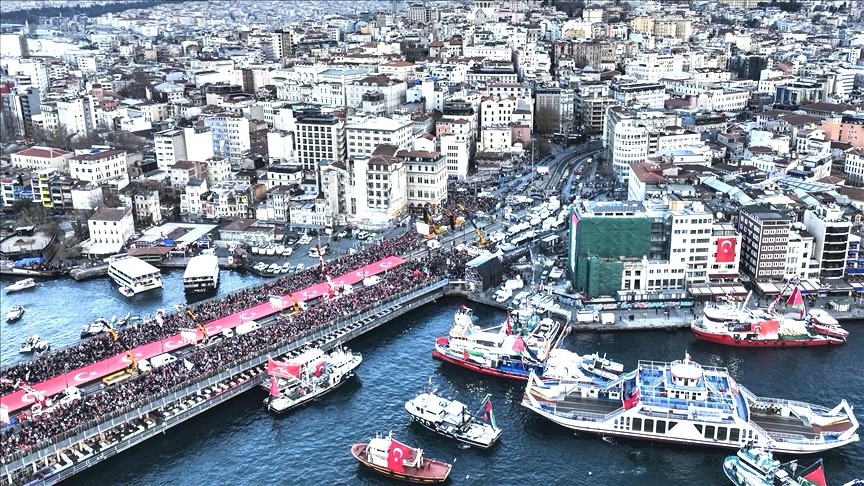 بدأ عشرات الآلاف من الأشخاص، الخميس، المسير نحو جسر غالاطة في إسطنبول للمشاركة في مسيرة تضامنية مع فلسطين، بعد أدائهم صلاة الفجر في مساجد المدينة.