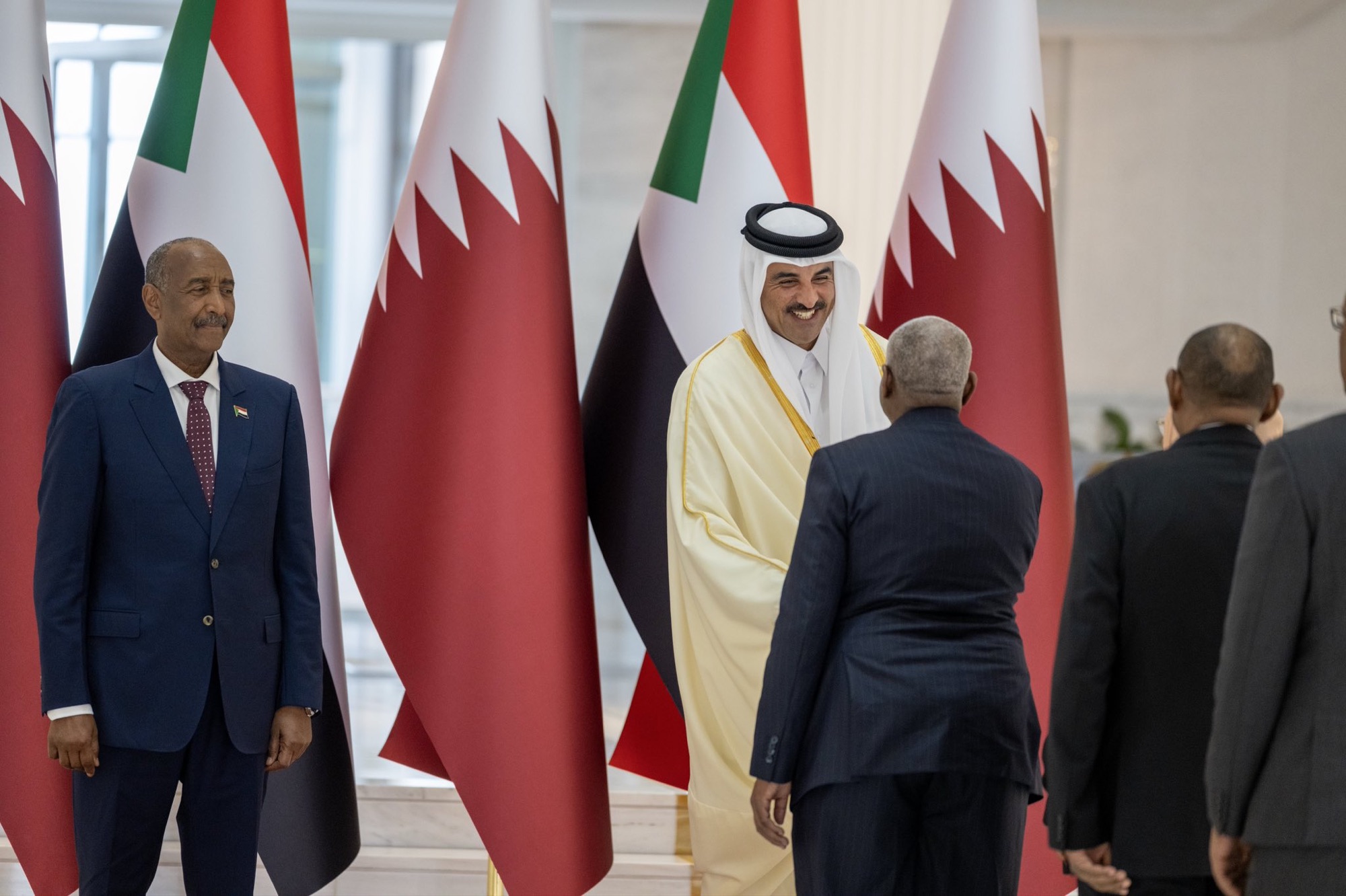 عقد حضرة صاحب السمو الشيخ تميم بن حمد آل ثاني أمير البلاد المفدى، وأخوه فخامة الفريق أول ركن عبدالفتاح البرهان رئيس مجلس السيادة الانتقالي بجمهورية السودان الشقيقة، جلسة مباحثات رسمية بالديوان الأميري اليوم.