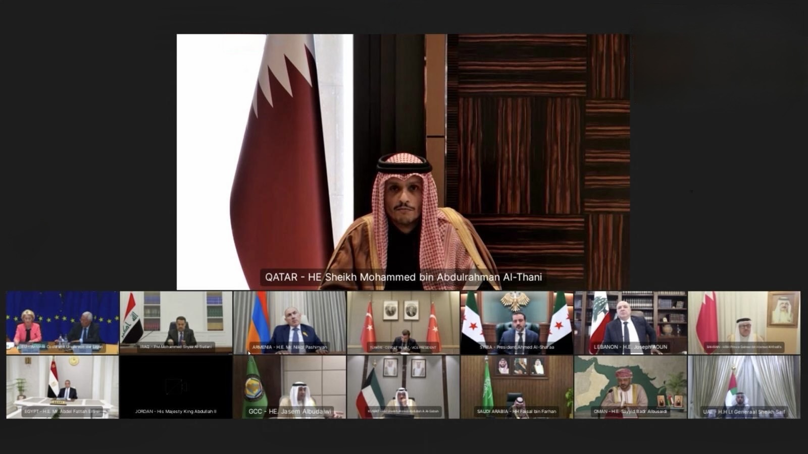 شاركت دولة قطر في قمة مشتركة لقادة دول مجلس التعاون لدول الخليج العربية، وجمهورية مصر العربية الشقيقة، والمملكة الأردنية الهاشمية الشقيقة، والجمهورية العربية السورية الشقيقة، وجمهورية العراق الشقيقة، والجمهورية اللبنانية الشقيقة، والجمهورية التركية الشقيقة، وجمهورية أرمينيا، والاتحاد الأوروبي، اليوم، عبر تقنية الاتصال المرئي.