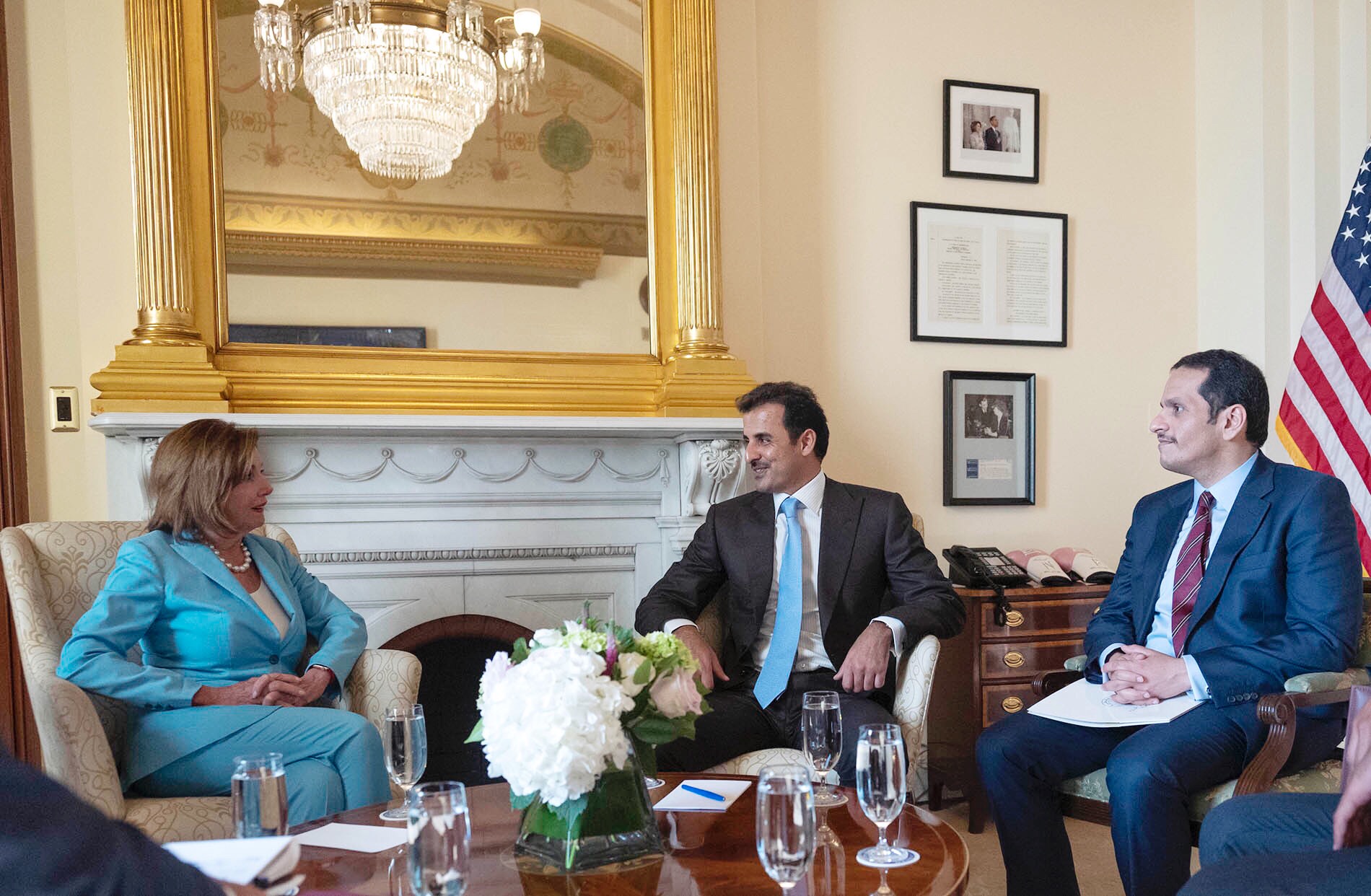التقى سمو أمير قطر الشيخ تميم بن حمد آل ثاني ، النائبة نانسي بيلوسي رئيسة مجلس النواب الأمريكي، وذلك بمقر الكونغرس في العاصمة واشنطن .وجرى خلال اللقاء استعراض العلاقات الاستراتيجية بين دولة قطر والولايات المتحدة الأمريكية الصديقة في مختلف المجالات وسبل تطويرها إلى آفاق أرحب.كما تناول اللقاء أبرز القضايا على الساحتين الإقليمية والدولية.