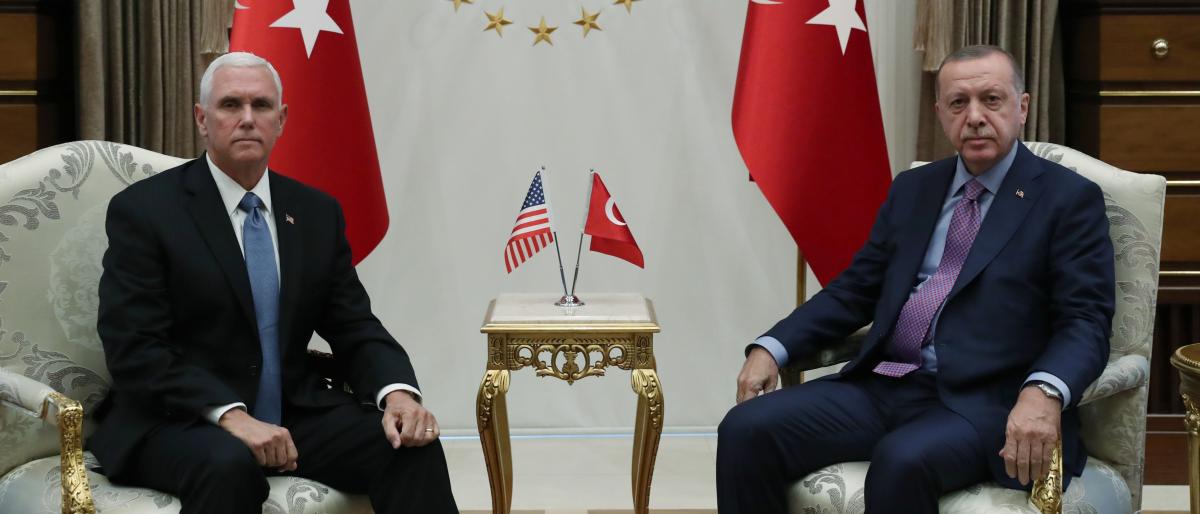 ذكرت وكالة الأنباء التركية “الأناضول”، أن اللقاء بين الرئيس التركي رجب طيب أردوغان ونائب الرئيس الأمريكي مايك بنس انتهى بعد أن استمر نحو ساعة، دون مزيد من التفاصيل. وكان أردوغان استقبل بنس، في المجمع الرئاسي بالعاصمة أنقرة، ظهر اليوم الخميس، لبحث الملف السوري والعملية العسكرية التي تنفذها تركيا شرقي نهر الفرات.