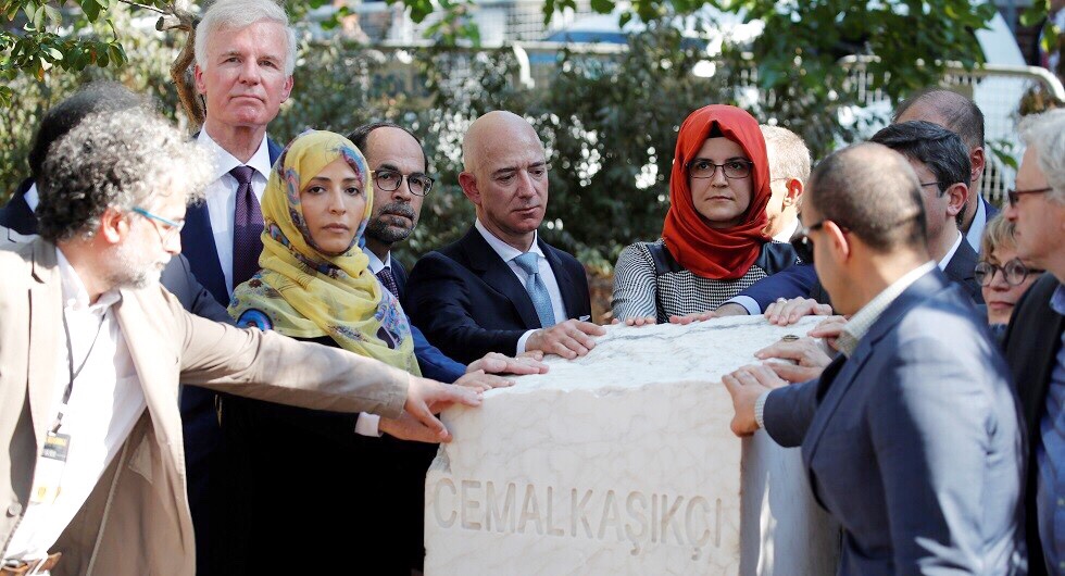 نشر مؤسس موقع أمازون ومالك صحيفة واشنطن بوست جيف بيزوس صورة من حفل افتتاح نصب لإحياء ذكرى الكاتب السعودي السابق في الصحيفة جمال خاشقجي الذي قتل داخل قنصلية بلاده في أسطنبول في أكتوبر 2018.