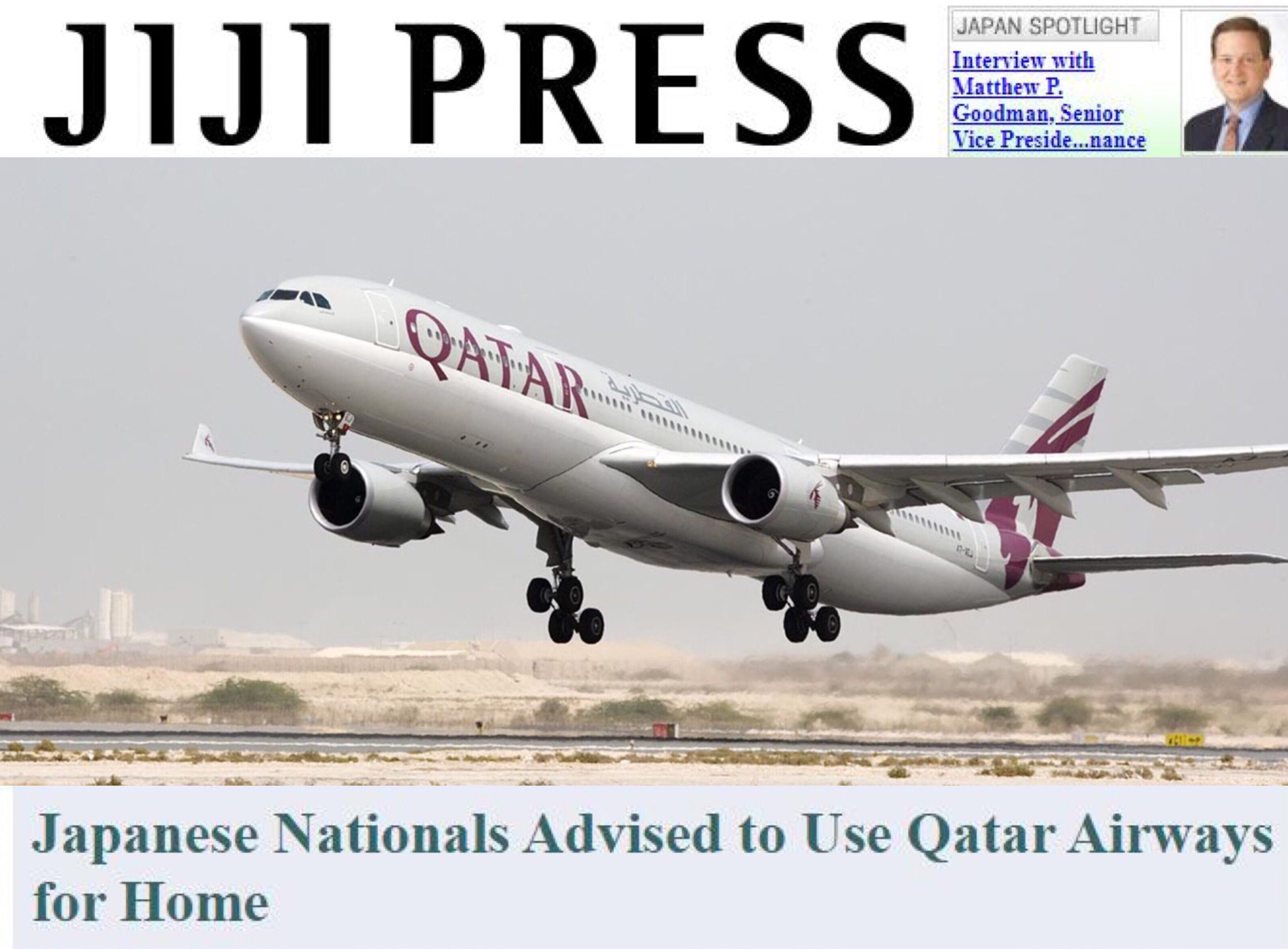 وأكد وزير الخارجية الياباني توشيميتسو موتيجي في اتصال هاتفي بينه وبين نظيره القطري الشيخ محمد بن عبد الرحمن آل ثاني ، إن عمليات الخطوط الجوية القطرية مهمة للغاية لعودة المواطنين اليابانيين المقيمين بالخارج إلى وطنهم ، مطالبين باستمرار خدمات الطيران بين البلدين من قبل شركة الطيران.