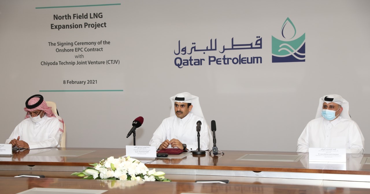 وتم الإعلان عن هذا القرار خلال حفل توقيع عقد الهندسة والمشتريات والإنشاءات الرئيسي لمنشآت المشروع البرية، بين قطر للبترول وتحالف يضم شركتي تشيودا وتكنيب، حيث وقع العقد كل من سعادة المهندس/ سعد بن شريدة الكعبي وزير الدولة لشؤون الطاقة، العضو المنتدب والرئيس التنفيذي لقطر للبترول، والسيد/ كاوزشي أوكاوا، رئيس مجلس الإدارة والرئيس التنفيذي لمؤسسة تشيودا، والسيد/ آرنو بييتون،رئيس شركة تكنيب للطاقة، وبحضور عدد من كبار المسؤولين من قطر للبترول وقطرغاز، وشركتي تشيودا وتكنيب.