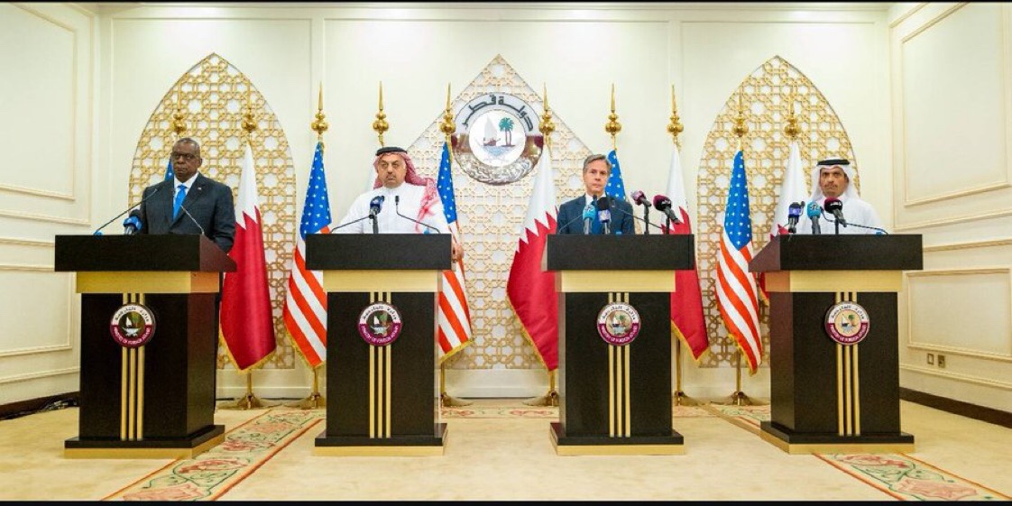 جاء ذلك خلال مؤتمر صحفي عقد اليوم، شارك فيه سعادة الشيخ محمد بن عبدالرحمن آل ثاني نائب رئيس مجلس الوزراء وزير الخارجية وسعادة السيد أنتوني بلينكن وزير خارجية الولايات المتحدة الأمريكية وسعادة السيد لويد أوستن وزير الدفاع بالولايات المتحدة الأمريكية.