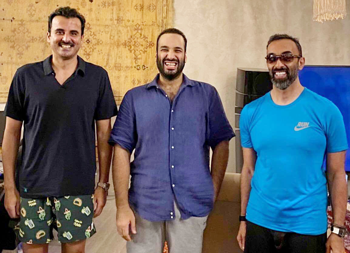 ذكر موقع وكالة الأناضول التركية نقلا عن مصدر سعودي ان لقاء وديا وأخويا جمع ولي العهد السعودي الأمير محمد بن سلمان وسمو أمير دولة قطر الشيخ تميم بن حمد آل ثاني ومستشار الأمن الوطني الإماراتي طحنون بن زايد.