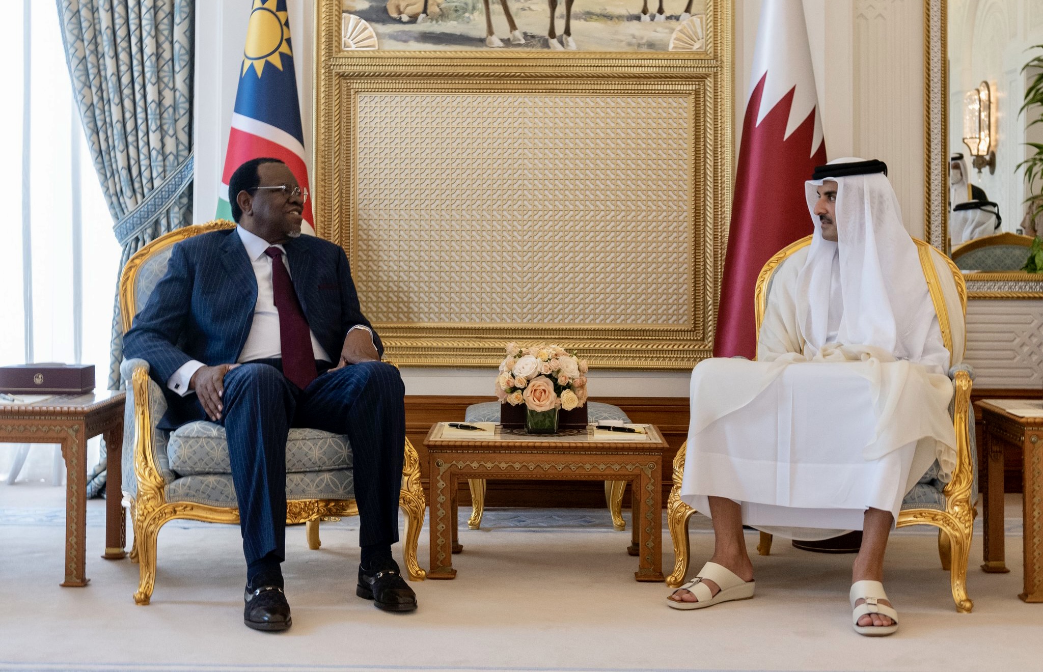 استقبل حضرة صاحب السمو الشيخ تميم بن حمد آل ثاني أمير البلاد المفدى، في الديوان الأميري صباح اليوم، فخامة الرئيس هاجي جينغوب رئيس جمهورية ناميبيا، والوفد المرافق له بمناسبة زيارته البلاد للمشاركة في أعمال منتدى قطر الاقتصادي 2022. وجرى خلال المقابلة استعراض العلاقات الثنائية بين البلدين، وآفاق تطويرها في شتى المجالات خاصة الاستثمار والطاقة، إلى جانب مناقشة عدد من القضايا الإقليمية والدولية محل الاهتمام المشترك. حضر المقابلة سعادة الشيخ سعود بن عبدالرحمن آل ثاني رئيس الديوان الأميري، وسعادة السيد سعد بن شريده الكعبي وزير الدولة لشؤون الطاقة، وسعادة السيد سلطان بن سعد المريخي وزير الدولة للشؤون الخارجية. فيما حضرها من جانب ناميبيا سعادة السيد توم الويندو وزير الطاقة والمناجم، وسعادة السيد ليبومبو شييمي وزير المالية.