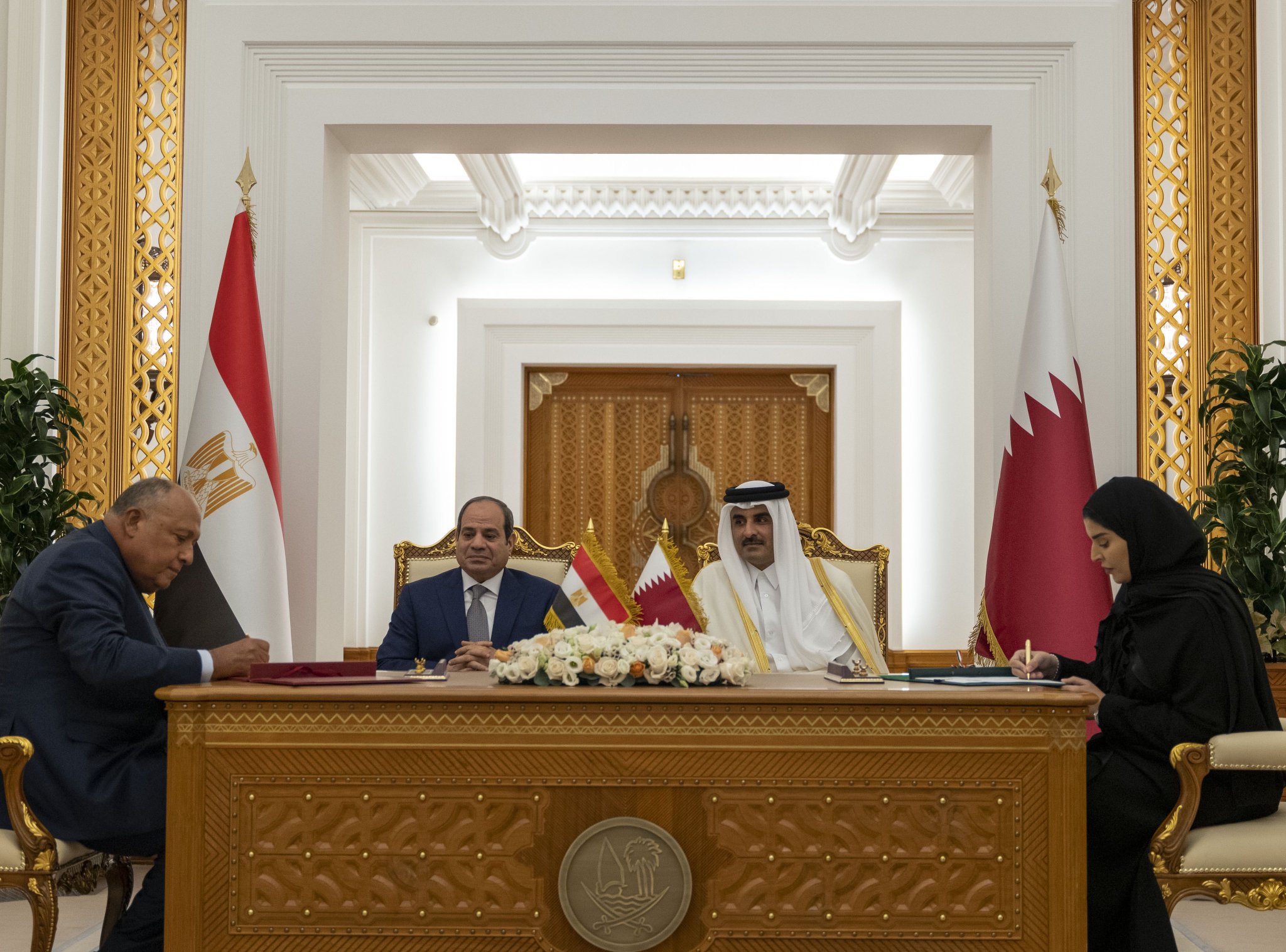 شهد حضرة صاحب السمو الشيخ تميم بن حمد آل ثاني أمير البلاد المفدى وأخوه فخامة الرئيس عبدالفتاح السيسي رئيس جمهورية مصر العربية الشقيقة، اليوم في الديوان الأميري، التوقيع على عدد من مذكرات التفاهم بين حكومتي البلدين.