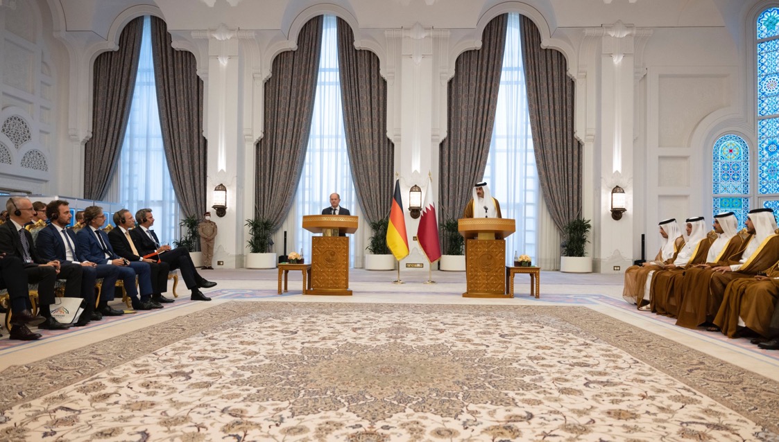 وأوضح دولة المستشار في تصريحاته أنه ناقش مع سمو الأمير واردات الغاز المسال، متطلعا لإحداث تقدم أكثر في هذا الإطار، مشيرا في الوقت نفسه إلى مواصلة التعاون مع قطر في مجال الهيدروجين وإنتاج الكهرباء، ومؤملا تعميق التعاون في مجالات اقتصادية أخرى مثل الملاحة الجوية والتكنولوجيا الحديثة والمعدات الثقيلة.