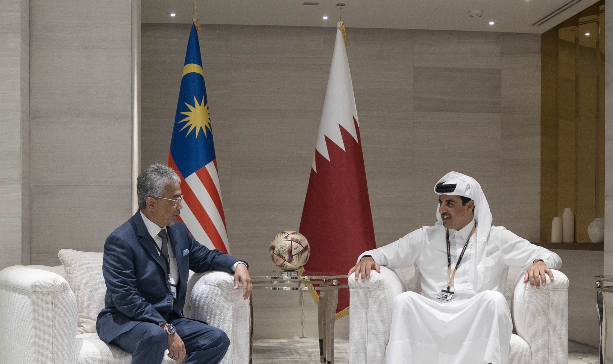 التقى حضرة صاحب السمو الشيخ تميم بن حمد آل ثاني أمير البلاد المفدى، مساء اليوم في استاد لوسيل، مع جلالة السلطان عبدالله رعاية الدين المصطفى بالله شاه ملك ماليزيا، والوفد المرافق، الذي يزور البلاد لحضور جانب من مباريات بطولة كأس العالم FIFA قطر 2022. وفي بداية اللقاء، هنأ جلالة ملك ماليزيا، سمو الأمير المفدى على استضافة وتنظيم بطولة كأس العالم FIFA قطر 2022، متمنياً التوفيق للمنتخبات المشاركة في البطولة.
