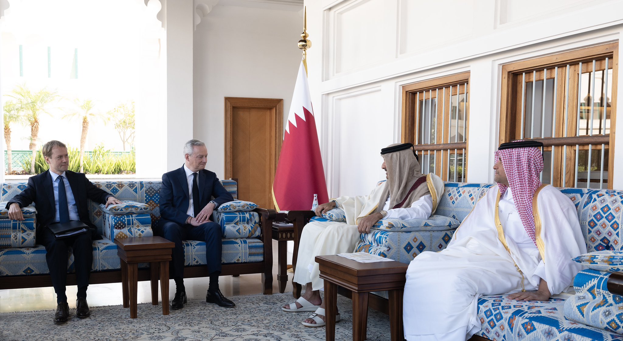 استقبل حضرة صاحب السمو الشيخ تميم بن حمد آل ثاني أمير البلاد المفدى، بمجلس الشيخ عبدالله بن جاسم بالديوان الأميري صباح اليوم، سعادة السيد برونو لومير وزير الاقتصاد والمالية والسيادة الصناعية والرقمية بالجمهورية الفرنسية، والوفد المرافق له بمناسبة زيارة البلاد.