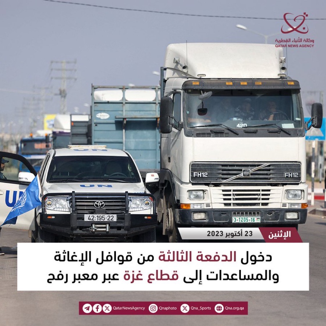 وتشمل الدفعة الثالثة من المساعدات قاطرات جديدة محملة بمواد غذائية ومياه شرب وأدوية ومستلزمات طبية وغيرها لإغاثة سكان القطاع الذين يعيشون ظروفا إنسانية صعبة منذ السابع من أكتوبر الجاري.