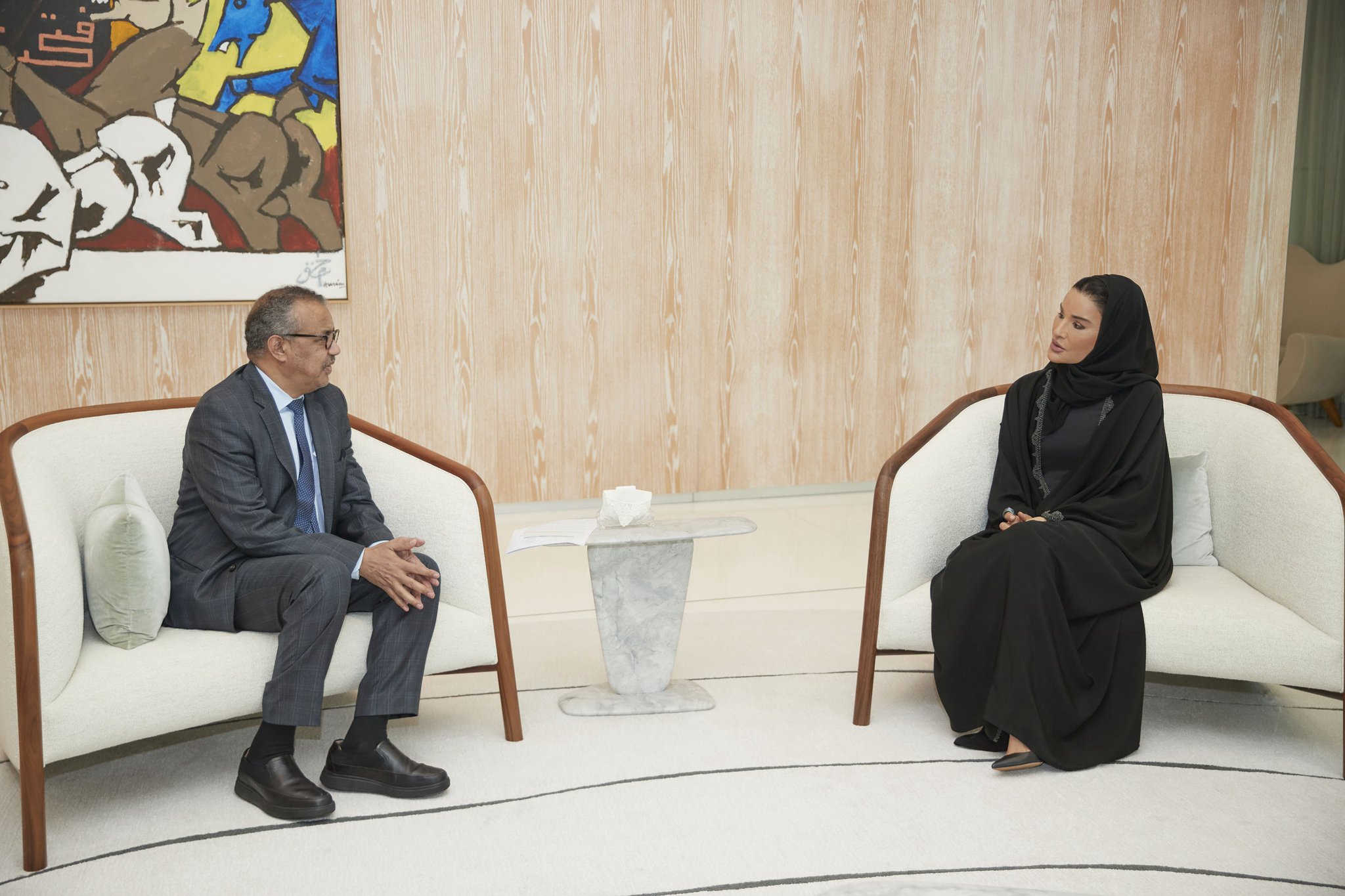 اجتمعت صاحبة السمو الشيخة موزا بنت ناصر، رئيس مجلس إدارة مؤسسة قطر للتربية والعلوم وتنمية المجتمع ومؤسسة التعليم فوق الجميع، اليوم، بسعادة الدكتور تيدروس أدهانوم غيبريسوس المدير العام لمنظمة الصحة العالمية.