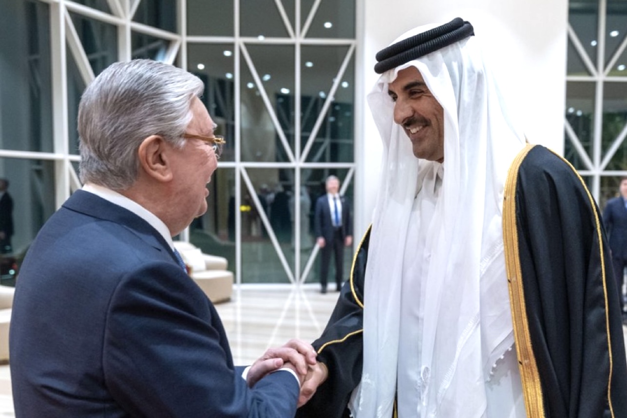 تقدم حضرة صاحب السمو الشيخ تميم بن حمد آل ثاني أمير البلاد المفدى، مستقبلي فخامة الرئيس قاسم جومارت توكاييف رئيس جمهورية كازاخستان الصديقة، لدى وصوله والوفد المرافق مساء اليوم الصالة الأميرية بمطار حمد الدولي، في زيارة دولة للبلاد.